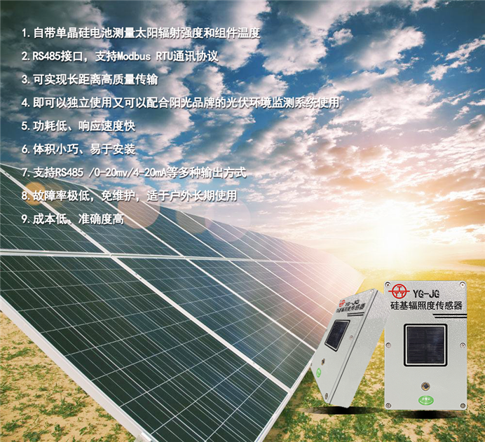 硅基輻照度傳感器是錦州陽(yáng)光氣象科技有限公司根據(jù)太陽(yáng)能電池板的特性,專門(mén)為光伏發(fā)電行業(yè)研制的一款低成本、高可靠性的太陽(yáng)輻照度測(cè)量傳感器。